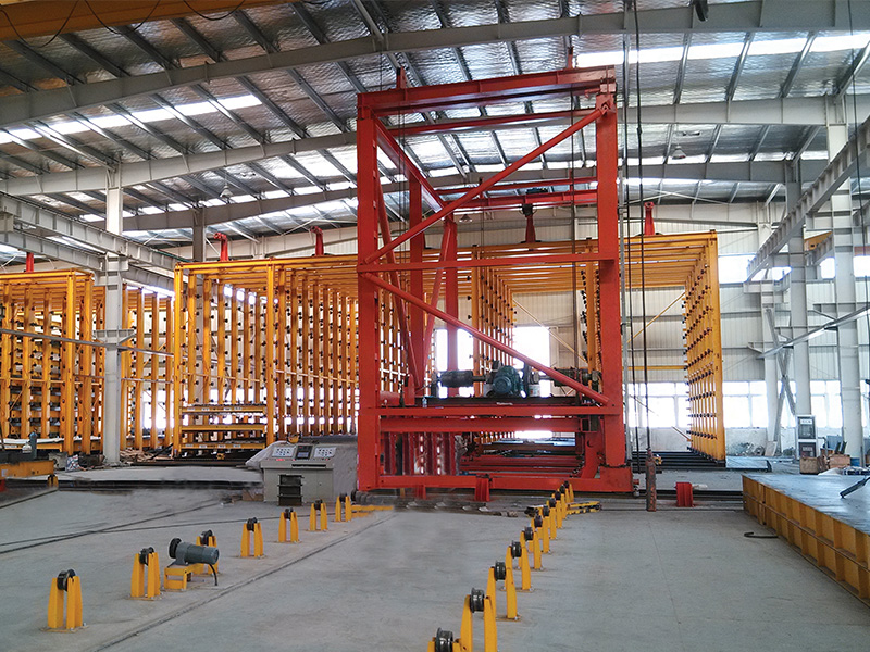 The stacker will send the vibrated and compacted cement components and molds to the designated position of the three-dimensional curing kiln, take the cured cement components and molds out of the curing kiln, return them to the production line and transport them to the designated demoulding position.